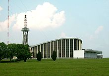 The building, in which the transmitters are situated, has a length of 82 metres, a width of 43 metres, and a height of 16 metres. Its surface area is 2,700 square metres and its volume 31,000 cubic metres. In front of this building, there is a telecommunication tower, which was used for broadcasting the programme of Telesaar.