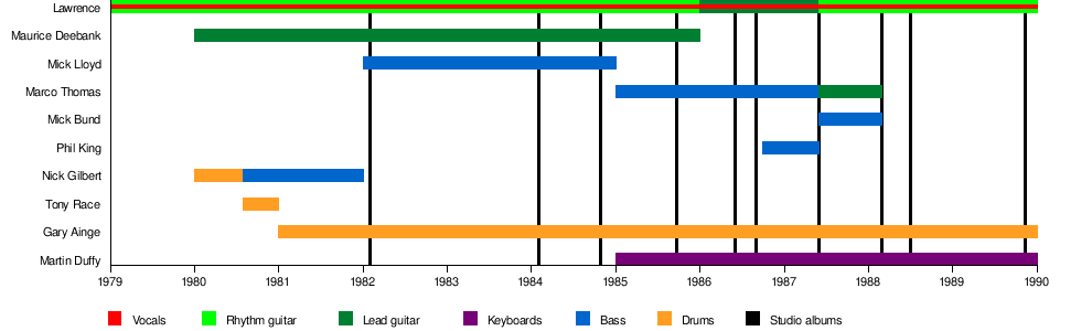 - Lawrence – vocals and guitar (1979–1989)