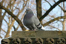 Feral pigeons (Columba livia domestica), also called city doves, city pigeons, or street pigeons,[3][4] are pigeons that are descended from the domestic pigeons that have returned to the wild.[5] The domestic pigeon was originally bred from the wild rock dove, which naturally inhabits sea-cliffs and mountains.[6] Rock (i.e., "wild"), domestic, and feral pigeons are all the same species and will readily interbreed. Feral pigeons find the ledges of buildings to be a substitute for sea cliffs, have become adapted to urban life, and are abundant in towns and cities throughout much of the world.[7] Owing to their abilities to create large amounts of excrement and be an occasional disease vector to humans combined with crop and property damage, pigeons are largely considered a nuisance and an invasive species, with steps being taken in many municipalities to lower their numbers or completely eradicate them.[3][4][8][9][10][11]