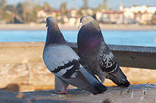 Current evidence suggests that wild, domestic and feral pigeons mate for life, although their long-term bonds are not unbreakable.[15] They are socially monogamous, but extra-pair matings do occur, often initiated by males.[16] Due to their ability to produce crop milk, pigeons can breed at any time of year.