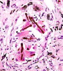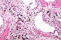 They appear as small brown nodules in the septum of the alveolus. Ferruginous bodies are typically indicative of asbestos inhalation (when the presence of asbestos is verified they are called "asbestos bodies"). In this case they are fibers of asbestos coated with an iron-rich material derived from proteins such as ferritin and hemosiderin.[1] Ferruginous bodies are believed to be formed by macrophages that have phagocytosed and attempted to digest the fibers.