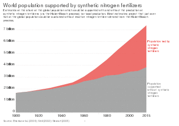 The 1910s and 1920s witnessed the rise of the Haber process and the Ostwald process. The Haber process produces ammonia (NH3) from methane (CH4) gas and molecular nitrogen (N2). The ammonia from the Haber process is then converted into nitric acid (HNO3) in the Ostwald process.[8] The use of synthetic nitrogen fertilizers has increased steadily in the last 50 years, rising almost 20-fold to the current rate of 100 million tonnes of nitrogen per year.[9] The development of synthetic nitrogen fertilizer has significantly supported global population growth — it has been estimated that almost half the people on the Earth are currently fed as a result of synthetic nitrogen fertilizer use.[10] The use of phosphate fertilizers has also increased from 9 million tonnes per year in 1960 to 40 million tonnes per year in 2000. A maize crop yielding 6–9 tonnes of grain per hectare (2.5 acres) requires 31–50 kilograms (68–110 lb) of phosphate fertilizer to be applied; soybean crops require about half, as 20–25 kg per hectare.[11] Yara International is the world's largest producer of nitrogen-based fertilizers.[12]