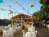 Various aspects of the festival originate from the European Midsummer celebrations, such as the creation of a large bonfire. Many of these celebrations now occur with influence from Brazilian rural society. The festivities usually take place in an arraial, a huge tent made of raw material (with a thatched roof) that was reserved for important parties in older Brazilian rural areas.[2] As the Brazilian climate differs greatly from Europe, Brazilian participants would often use the festival as a way to show gratitude for rain.[3] The creation of a large fire, known as a fogueira, is lit during the festival. This originates from a Catholic story of a fire being lit to warn Mary about the birth of St. John the Baptist, and thus to have her assistance after childbirth, Elizabeth would have to light a fire on a hill.