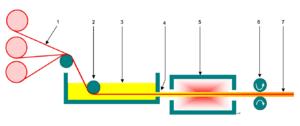 The process of manufacturing fiberglass is called pultrusion. The manufacturing process for glass fibers suitable for reinforcement uses large furnaces to gradually melt the silica sand, limestone, kaolin clay, fluorspar, colemanite, dolomite and other minerals until a liquid forms. It is then extruded through bushings, which are bundles of very small orifices (typically 5–25 micrometres in diameter for E-Glass, 9 micrometres for S-Glass).[10]