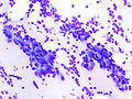 The diagnostic findings on needle biopsy consist of abundant stromal cells, which appear as bare bipolar nuclei, throughout the aspirate; sheets of fairly uniform-size epithelial cells that are typically arranged in either an antler-like pattern or a honeycomb pattern. These epithelial sheets tend to show typical metachromatic blue on Diff-Quik staining. Foam cells and apocrine cells may also be seen, although these are less diagnostic features.[8][9] The gallery images below demonstrate these features.