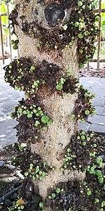 Ficus sycomorus grows to 20 m tall and has a considerable spread as can be seen from the photograph below left, with a dense round crown of spreading branches. The leaves are heart-shaped with a round apex, 14 cm long by 10 cm wide, and arranged spirally around the twig. They are dark green above and lighter with prominent yellow veins below, and both surfaces are rough to the touch. The petiole is 0.5–3 cm long and pubescent. The fruit is a large edible fig, 2–3 cm in diameter, ripening from buff-green to yellow or red. They are borne in thick clusters on long branchlets or the leaf axil. Flowering and fruiting occurs year-round, peaking from July to December. The bark is green-yellow to orange and exfoliates in papery strips to reveal the yellow inner bark. Like all other figs, it contains a latex.