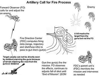 Because artillery is an indirect fire weapon, the forward observer (FO) must take up a position where he can observe the target using tools such as binoculars and laser rangefinders and call back fire missions on his radio or telephone.