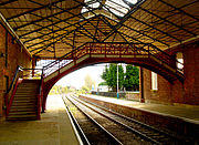 The station building was completed in 1846 to the designs of G.T. Andrews; a single storey red brick structure with slate roof and sandstone dressings, with a 7 bay main entrance projected from the station.[1] The platforms were 276 and 277 feet (84 and 84 m) long.[3] The trainshed roof was common Andrew's design using a wrought iron truss structure supporting a wood and slate roof.[3]