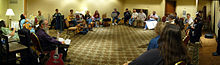 Traditionally, filk circles are started in the evening and tend to continue very late into the night.[6] Of course, this depends upon the location, the participants, and the organizers. Filk circles have been known to continue all night, or at least into the early morning hours. Those organizing formal filk circles at conventions usually make arrangements with the hotel to have space available for the entire night. There are many exceptions to this; it is not uncommon to find a housefilk scheduled to start in the early afternoon and end in the early evening, for example, to allow participants to get home to sleep.