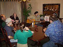 A wide range of instruments can be found in a filk circle, although the most common is the acoustic guitar.[6] Acoustic instruments are more common than electric instruments, although portable keyboards and even theremins are not unheard of.[16] Small, easily portable instruments are more common than large ones, although larger items such as small drum kits and upright basses can be found at some filk circles. A large filk circle might play host to an array of folk and Celtic instruments such as fiddles, mandolins, dulcimers, banjos, flutes, recorders, bodhráns, bongos and darbukas.[17]