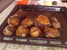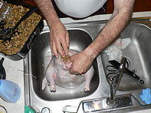 In addition to stuffing the body cavity of animals, including birds, fish, and mammals, various cuts of meat may be stuffed after they have been deboned or a pouch has been cut into them. Recipes include stuffed chicken legs,[10] stuffed pork chops,[11] stuffed breast of veal,[12] as well as the traditional holiday stuffed turkey or goose.