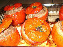 Many types of vegetables are also suitable for stuffing, after their seeds or flesh has been removed. Tomatoes, capsicums (sweet or hot peppers), vegetable marrows (e.g., zucchini) may be prepared in this way. Cabbages and similar vegetables can also be stuffed or wrapped around a filling. They are usually blanched first, in order to make their leaves more pliable. Then, the interior may be replaced by stuffing, or small amounts of stuffing may be inserted between the individual leaves.[13]