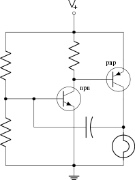 A capacitor can possess spring-like qualities in an oscillator circuit. In the image example, a capacitor acts to influence the biasing voltage at the npn transistor's base. The resistance values of the voltage-divider resistors and the capacitance value of the capacitor together control the oscillatory frequency.