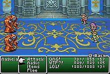 On the overworld and within dungeons, random encounters with enemies can be fought to improve each character's attributes.[6] Unlike the original Final Fantasy, players cannot upgrade their characters' classes. The game is also one of the few games in the series to not use experience-based levels. Instead, each character participating in battle develops depending on what actions they take. For instance, characters who frequently use a particular type of weapon will become more adept at wielding a weapon of that type, and will also increase in physical strength and accuracy.[5][6] Attributes include hit points, magic points, magic power, stamina, strength, spirit, agility, intelligence, and evasion. Hit points (HP) and magic points (MP) increase with their use; a character who takes a heavy amount of damage in a battle might earn an increase in maximum HP, while a character who uses a lot of MP during battle might increase their maximum MP.[6] This experience system had several unintended consequences that allowed characters to gain much more experience than intended, such as players having their characters attack each other and repeatedly cast spells, thus causing their HP and abilities to grow extensively.[5] Final Fantasy II uses the same turn-based battle system seen in the original Final Fantasy, with battle parties consisting of up to four characters at a time. The game introduces a "back row" in battle, within which characters or enemies are immune to most physical attacks, but can be harmed with bows and magical attacks.[3]