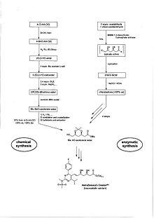 Biosynthesis i.e. the conversion of organic materials into fine chemicals by microorganisms, is used for the production of both small molecules (using enzymes in whole cell systems) and less complex, non-glycosylated big molecules, including peptides and simpler proteins. The technology has been used for 10,000 years to produce food products, like alcoholic beverages, cheese, yogurt, and vinegar. In contrast to biocatalysis, a biosynthetic process does not depend on chemicals as starting materials, but only on cheap natural feedstock, such as glucose, to serve as nutrient for the cells. The enzyme systems triggered in the particular microorganism strain lead to the excretion of the desired product into the medium, or, in the case of HMW peptides and proteins, to the accumulation within so-called inclusion bodies in the cells. The key elements of fermentation development are strain selection and optimization, as well as media and process development. Dedicated plants are used for large-scale industrial production. As the volume productivity is low, the bioreactors, called fermenters, are large, with volumes that can exceed 250 m3. Product isolation was previously based on large-volume extraction of the medium containing the product. Modern isolation and membrane technologies, like reverse osmosis, ultra- and nano-filtration, or affinity chromatography can help to remove salts and by-products, and to concentrate the solution efficiently and in an environmentally friendly manner under mild conditions. The final purification is often achieved by conventional chemical crystallization processes. In contrast to the isolation of small molecules, the isolation and purification of microbial proteins is tedious and often involves a number of expensive large-scale chromatographic operations. Examples of large-volume LMW products made by modern industrial microbial biosynthetic processes are monosodium glutamate (MSG), vitamin B2 (riboflavin), and vitamin C (ascorbic acid). In vitamin B2, riboflavin, the original six- to eight-step synthetic process starting from barbituric acid has been substituted completely by a microbial one-step process, allowing a 95% waste reduction and an approximately 50% manufacturing cost reduction. In ascorbic acid, the five-step process (yield ≈ 85%) starting from D-glucose, originally invented by Tadeus Reichstein in 1933, is being gradually substituted by a more straightforward fermentative process with 2-ketogluconic acid as pivotal intermediate.[12] After the discovery of penicillin in 1928 by Sir Alexander Fleming from colonies of the bacterium Staphylococcus aureus, it took more than a decade before a powdery form of the medicine was developed.[13] Since then, many more antibiotics and other secondary metabolites have been isolated and manufactured by microbial fermentation on a large scale. Some important antibiotics besides penicillin are cephalosporins, azythromycin, bacitracin, gentamycin, rifamycin, streptomycin, tetracycline, and vancomycin.