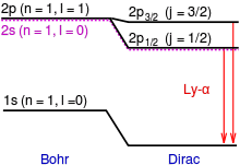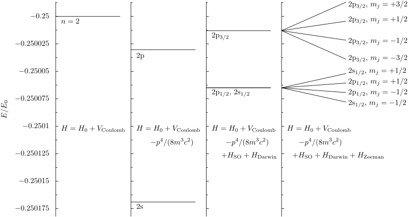The total effect can also be obtained by using the Dirac equation. In this case, the electron is treated as non-relativistic. The exact energies are given by[6]