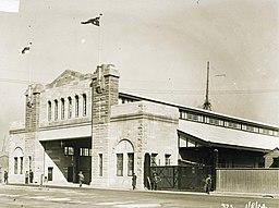The Woolloomooloo Finger Wharf appeared during an era of large finger wharf building. It was built on the site of Sydney's first fish market (1872-1910) for the Sydney Harbour Trust, which was created in 1900 to bring order to the chaotic state of the wharves throughout the harbour and began a substantial rebuilding programme.[1][3] The jetty was commenced in 1910 and was largely completed by 1913. The Trust's Engineer-In-Chief, Henry D. Walsh, designed the massive waterfront building.[4]