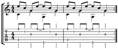 The thumb (T) alternates between bass notes, often on two different strings, while the index (I) and middle (M) fingers alternate between two treble notes, usually on two different strings, most often the second and first. Using this pattern on a C major chord is as follows in notation and tablature: