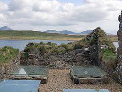 Finlaggan Castle (Scottish Gaelic: Port an Eilein, English: Port of the Island), also known as Eilean Mor Castle is a ruined fortified house located on the isle of Eilean Mór on Loch Finlaggan, Islay, Scotland. It was once a residence and stronghold of Lord of the Isles and Clan Donald.