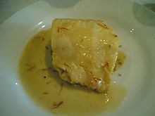 Finnan haddie (also known as Finnan haddock, Finnan, Finny haddock or Findrum speldings) is cold-smoked haddock, representative of a regional method of smoking with green wood and peat in north-east Scotland.[1] Its origin is the subject of a debate, as some sources attribute the origin to the hamlet of Findon, Aberdeenshire, (also sometimes called Finnan) near Aberdeen,[2][3] while others insist that the name is a corruption of the village name of Findhorn at the mouth of the River Findhorn in Moray.[4] The "dispute" goes back to the eighteenth century, although it is hard to trace, as adherents fail to acknowledge even the possibility of the alternative view (except for the etymology note in the Oxford English Dictionary).[5] A testimonial in an early 20th century Boston cookbook describes the origin from a fire in a fish curing house in Portlethen, very near Findon. [6] It may have been a popular dish in Aberdeenshire since at least as early as the 1640s.[7]
