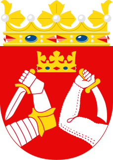 The arms is crowned by a ducal coronet, though by Finnish tradition this more resembles a Swedish count's coronet. The symbolism of the coat of arms is supposed to represent how the region was fought over by Sweden and Russia for centuries. Blazon: "Gules, in center chief a crown or above two duelling arms, the dexter armored holding a sword and the sinister chain-mail armored with a scimitar, all argent except for hafts and gauntlet joint or."