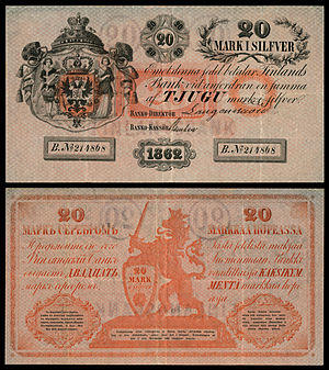 The markka was introduced in 1860[1] by the Bank of Finland, replacing the Russian ruble at a rate of four markkas to one ruble. Senator Fabian Langenskiöld is called "father of markka". In 1865, the markka was separated from the Russian ruble and tied to the value of silver.[2] From 1878 to 1915, Finland adopted the gold standard of the Latin Monetary Union.[3] Before the markka, both the Swedish riksdaler and Russian ruble were used side-by-side for a time.