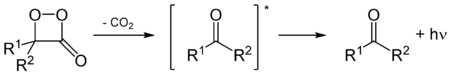 In firefly, oxidation of luciferins, which is catalyzed by luciferases, yields a peroxy compound 1,2-dioxetane. The dioxetane is unstable and decays spontaneously to carbon dioxide and excited ketones, which release excess energy by emitting light (bioluminescence).[13]