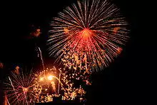 Fireworks are a class of low explosive pyrotechnic devices used for aesthetic and entertainment purposes. The most common use of a firework is as part of a fireworks display (also called a fireworks show or pyrotechnics), a display of the effects produced by firework devices. Fireworks competitions are also regularly held at a number of places.