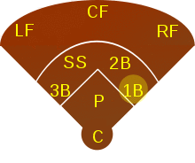 A first baseman, abbreviated 1B, is the player on a baseball or softball team who fields the area nearest first base, the first of four bases a baserunner must touch in succession to score a run. The first baseman is responsible for the majority of plays made at that base. In the numbering system used to record defensive plays, the first baseman is assigned the number 3.