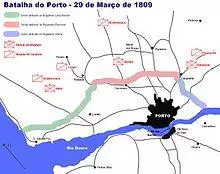 In the First Battle of Porto (28 March 1809) the French under Marshal Soult defeated the Portuguese, under General Parreiras, outside the city of Porto[1] during the Peninsular War. Soult followed up his success by storming the city.