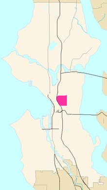 First Hill is a neighborhood in Seattle, Washington, United States. It is named for the hill on which it is located, which in turn is so named for being the first hill encountered while traveling east from downtown Seattle toward Lake Washington. First Hill is bounded on the west by Interstate 5, beyond which is Downtown, on the north by E. Pike and E. Madison Streets, beyond which is Capitol Hill, and on the south by S. Main St., beyond which is the International District. The City of Seattle provides conflicting information about its eastern limit, beyond which are Cherry Hill and the Central District. Some describe it as being bounded by Broadway and Boren Avenues,[1] while others describe it as being bounded by 12th Avenue.[2]