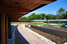 In 1945, the Society elected to sell their original buildings after receiving a substantial offer for the property originally located downtown Madison, WI.[4] The following year, after much debate, the Society commissioned Frank Lloyd Wright to design the new Meeting House.[4] Four acres of land in Shorewood Hills, surrounded by few structures and overlooking the University of Wisconsin agricultural fields, was purchased as the new site.[4] The new building opened in 1951.[4] Today, the University of Wisconsin hospital and a busy University Avenue surround the Meeting House.