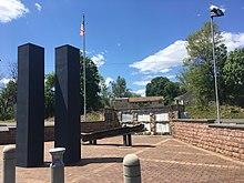 - In Union City, New Jersey, which lost four of its residents during the attacks, the first 9/11 memorial was a sculpture placed in Doric Park, in whose courtyard citizens gathered on September 11, 2001, to view the attacks' aftereffects.[43] On September 11, 2007, the city dedicated its Liberty Plaza to commemorate the event. The Plaza, which serves as a transit hub through which commuters pass on their way to and from Manhattan, includes two memorial markers.[44][45] In subsequent years, citizens of neighboring towns have been honored at Liberty Plaza, including North Bergen resident David Lemagne, a Port Authority police officer who grew up in Union City, and perished during the attacks.[46] Doric Park was later rebuilt as Firefighters Memorial Park, which opened in August 2009. A new memorial to local firefighters who gave their lives in the line of duty now stands in the entrance to the park's entrance,[47] whose popularity has attracted visitors from Manhattan and Staten Island.[48]