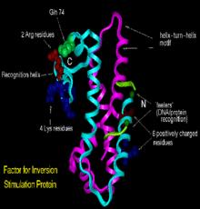 Fis was first discovered for its role in stimulating Gin catalyzed inversion of the G segment of phage Mu genome.[1] Fis was originally identified as the factor for inversion stimulation of the homologous Hin and Gin site-specific DNA recombinases of Salmonella and phage Mu, respectively. This small, basic, DNA-bending protein has recently been shown to function in many other reactions including phage lambda site-specific recombination, transcriptional activation of rRNA and tRNA operons, repression of its own synthesis, and oriC-directed DNA replication. Cellular concentrations of Fis vary tremendously under different growth conditions which may have important regulatory implications for the physiological role of Fis in these different reactions.[2]