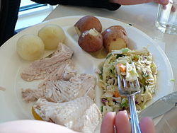 The cooking of the fish is an elaborate presentation. Restaurants typically ask that patrons arrive a half-hour early to witness the boiling. The fish and potatoes are prepared in a cast-iron kettle. When the water comes to a boil, the potatoes, kept in a wire basket, are lowered in.