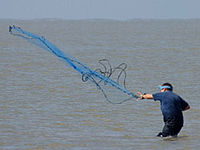 Cast net | ![]() | Schooling and other small fish | Cast nets (throw nets) are small round nets with weights on the edges which are thrown by the fisher. Sizes vary up to about four metres in diameter. The net is thrown by hand in such a manner that it spreads out on the water and sinks. Fish are caught as the net is hauled back in.[17] | High discrimination possible. Non targeted fish can be released unharmed. |