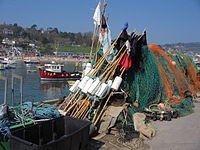 Seine net | ![]() | A seine is a large fishing net that may be arranged in a number of different ways. In purse seine fishing the net hangs vertically in the water by attaching weights along the bottom edge and floats along the top. A simple and commonly used fishing technique is with beach seine, where the seine net is operated from the shore. Danish seine is a method which has some similarities with trawling. In the UK seine netting for Salmon and Sea-trout in coastal waters is only permitted in a very few locations and where it is permitted one end of the seine must remain fixed and the other end is then waded out and returns to the fixed point. This variant is called Wade netting and is strictly controlled by law.[28] | ||