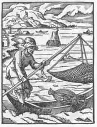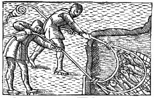 The fishers set up very light nets of buoyant flax and wheel in a circle round about while they violently strike the surface of the sea with their oars and make a din with sweeping blow of poles. At the flashing of the swift oars and the noise the fish bound in terror and rush into the bosom of the net which stands at rest, thinking it to be a shelter: foolish fishes which, frightened by a noise, enter the gates of doom. Then the fishers on either side hasten with the ropes to draw the net ashore.