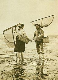 Coracle net fishing | ![]() | Coracle fishing is performed by two people, each seated in a coracle, plying their paddle with one hand and holding a shared net with the other. When a fish is caught, each hauls up their end of the net until the two coracles are brought to touch and the fish is secured. | ||