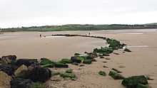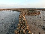 In Great Britain the traditional form was one or more rock weirs constructed in tidal races or on a sandy beach, with a small gap that could be blocked by wattle fences when the tide turned to flow out again. Surviving examples, but no longer in use, can be seen in the Menai Strait, with the best preserved examples to be found at Ynys Gored Goch (Red Weir Island) dating back to around 1842.[9] Also surviving are 'goredi' (originally twelve in number) on the beach at Aberarth, Ceredigion. Another ancient example was at Rhos Fynach in North Wales, which survived in use until World War I.[10] The medieval fish weir at Traeth Lligwy, Moelfre, Anglesey (pictured) was scheduled as an Ancient Monument in 2002.[11]