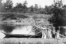 The Cree of the Hudson Bay Lowlands used weirs consisting of a fence of poles and a trap across fast flowing rivers. The fish were channelled by the poles up a ramp and into a box-like structure made of poles lashed together. The top of the ramp remained below the surface of the water but slightly above the top of the box so that the flow of the water and the overhang of the ramp stopped the fish from escaping from the box. The fish were then scooped out of the box with a dip net.[18]
