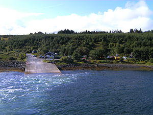 It consists of a slipway sticking out into the Sound of Mull with a vehicle queuing area stretching back onto the road, a car park next to the slipway, and a small café next to the slipway with public toilets and an electronic display showing ferry times and other information.[1]