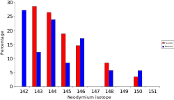 A great deal of the lighter lanthanides (lanthanum, cerium, neodymium, and samarium) are formed as fission products. In Africa, at Oklo where the natural nuclear fission reactor operated over a billion years ago, the isotopic mixture of neodymium is not the same as 'normal' neodymium, it has an isotope pattern very similar to the neodymium formed by fission.