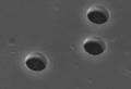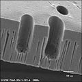 | Single ion irradiations are used to fabricate individual micro- and nanostructures such as cones, channels, pins and wires.[20] The technique requires a weak ion beam which can be switched off after one ion has penetrated the target foil. | |