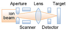 | Ion microbeams offer the highest level of control of the irradiation process. These restrict the output of a heavy ion accelerator to a small filament which can be scanned over the sample surface. Scribing with individual swift heavy ions is possible with an aiming precision of about one micrometer.[21] |