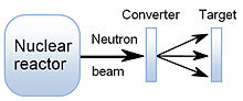| Nuclear reactors provide fission fragments with broad angular-, mass-, and energy distributions. Similar to alpha and fission sources, the penetration range of the emitted fission fragments is limited to about 15 micrometers in polymers. Nuclear reactors are used for filter production. | |