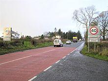 • The A4 is the main route into Fermanagh (and on to County Sligo) from the Belfast direction. Running from the end of the M1 at Dungannon, the section through the Clogher Valley is the lowest standard on the whole route. While towns and villages along the A4 in Fermanagh were generally bypassed years ago, the A4 runs straight through the middle of three Tyrone villages: Augher, Clogher and Fivemiletown. These are now the only non-bypassed settlements on the road. The largest of these, Fivemiletown, will be bypassed. The village currently has a one-way system to cope with the heavy traffic on the narrow main street, but this stalls long-distance traffic and is a big inconvenience to residents of the village. The new road will be built to 2+1 standard, meaning that there will be one lane in one direction, with two in the opposite direction to permit overtaking. On longer routes, such as this one, the overtaking lane usually alternates giving an overtaking opportunity to traffic in each direction. The scheme will complement a 2+1 scheme completed on the A4 outside Fivemiletown in 2004.[7]