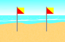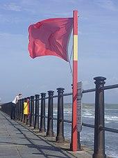 In Australia, Canada, New Zealand, the Philippines, Republic of Ireland and the United Kingdom, a pair of red-yellow flags is used to mark the limits of the bathing area on a beach, usually guarded by surf lifesavers. If the beach is closed, the poles of the flags are crossed. The flags are coloured with a red triangle and a yellow triangle making a rectangular flag, or a red rectangle over a yellow rectangle. On many Australian beaches there is a slight variation with beach condition signalling. A red flag signifies a closed beach (in the UK also other dangers), yellow signifies strong current or difficult swimming conditions, and green represents a beach safe for general swimming. In Ireland, a red and yellow flag indicates that it is safe to swim; a red flag that it is unsafe; and no flag indicates that there are no lifeguards on duty. Blue flags may also be used away from the yellow-red lifesaver area to designate a zone for surfboarding and other small, non-motorised watercraft.