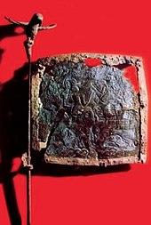 The origin of the flag is unknown.[1] In antiquity, field signs or standards were used in warfare that can be categorised as vexilloid or 'flag-like'. This originated in ancient Egypt or Assyria.[2] Examples include the Sassanid battle standard Derafsh Kaviani, and the standards of the Roman legions such as the eagle of Augustus Caesar's Xth legion, or the dragon standard of the Sarmatians; the latter was let fly freely in the wind, carried by a horseman, but judging from depictions it was more similar to an elongated dragon kite than to a simple flag.