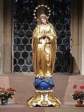 An article posted in La Raison in February 2000 further connected the donation of a stained glass window for Strasbourg Cathedral by the Council of Europe on 21 October 1956. This window, a work by Parisian master Max Ingrand, shows a blessing Madonna underneath a circle of 12 stars on dark blue ground.[18] The overall design of the Madonna is inspired by the banner of the cathedral's Congrégation Mariale des Hommes, and the twelve stars are found on the statue venerated by this congregation inside the cathedral (twelve is also the number of members of the congregation's council).[19] The Regional Office for Cultural Affairs describe this stained glass window called "Le vitrail de l'Europe de Max Ingrand" (The Glass Window of Europe of Max Ingrand).[20]